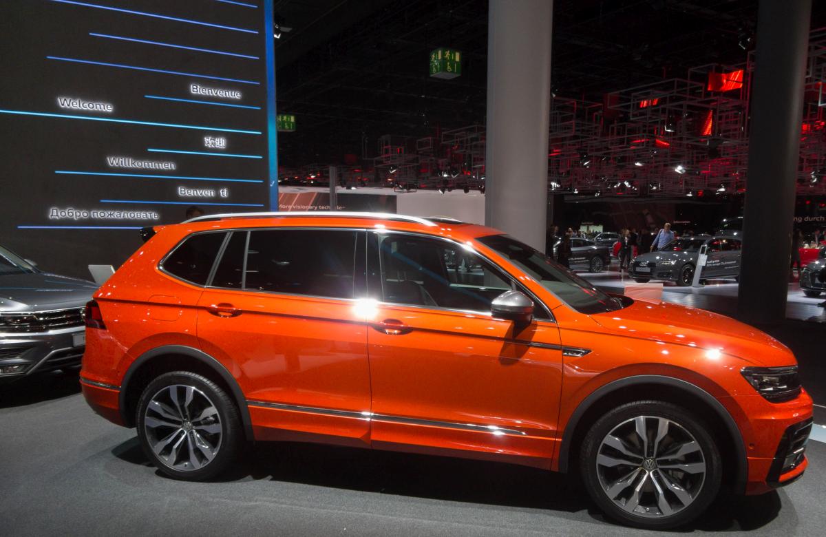 VW Tigual AllSpace in orange, ausgestellt auf der IAA 2017 Frankfurt Motor Show (September 2017).