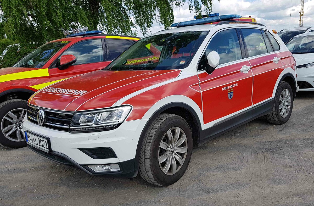 =VW Tiguan der Feuerwehr vom Landkreis HÖXTER, gesehen auf dem Parkplatzgelände der RettMobil 2022 in Fulda, 05-2022
