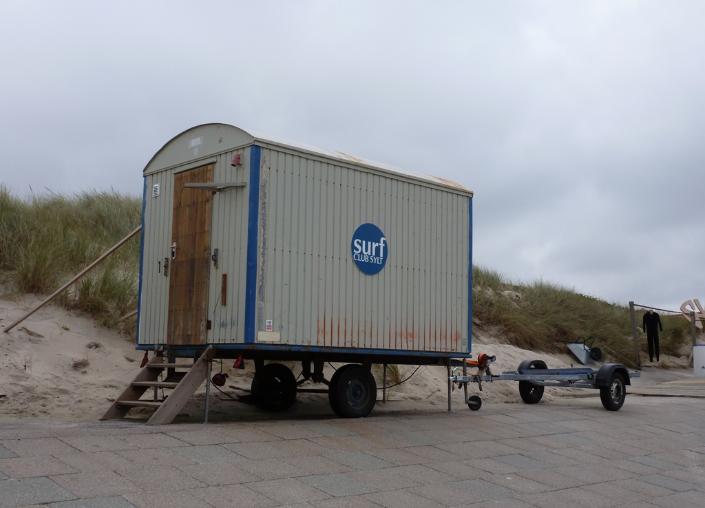 Bauwagen grau blau surf CLUB SYLT daneben ein Trailer in Westerland am Strand 01.09.2014