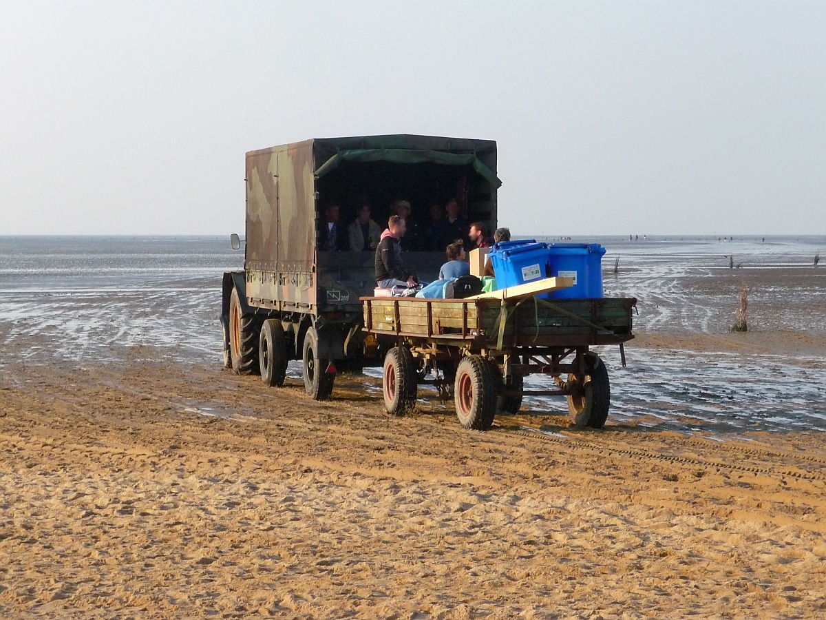Ein Trecker-Gespann auf dem Weg durchs Watt zur Insel Neuwerk; Sahlenburg, 11.9.2015