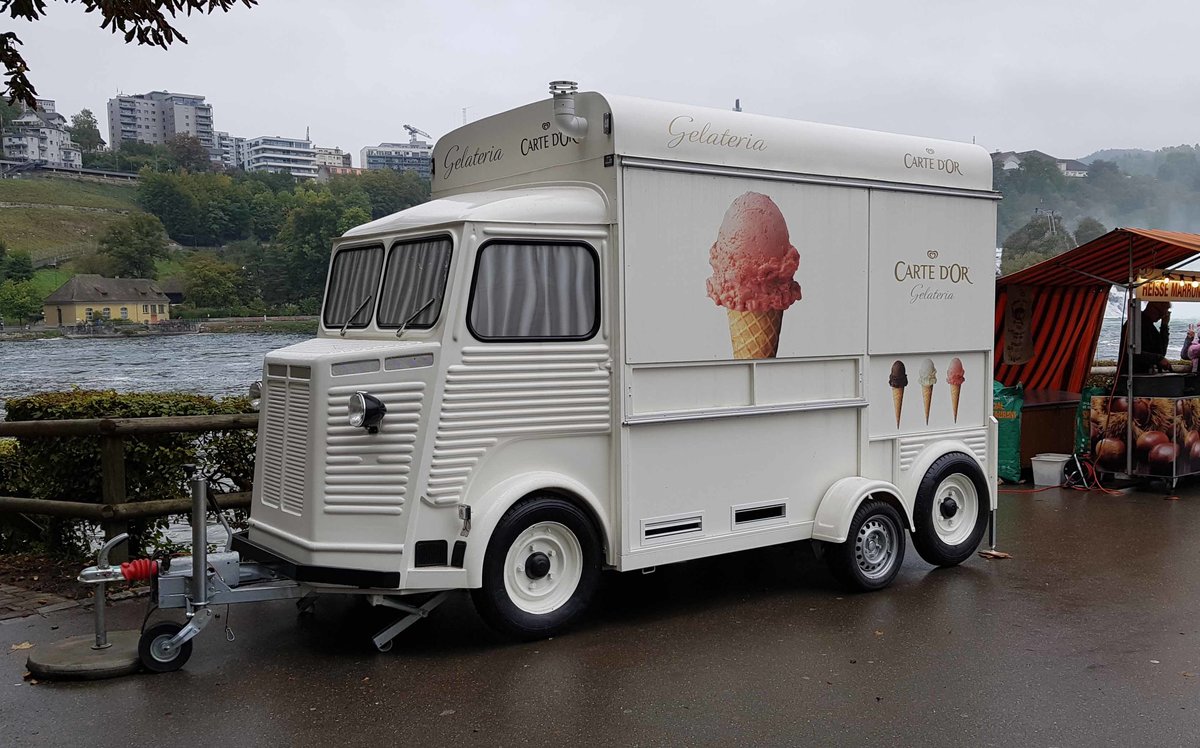 =Citroen Typ H-Replik als Eisstand, gesehen am Rheinfall im Oktober 2019
