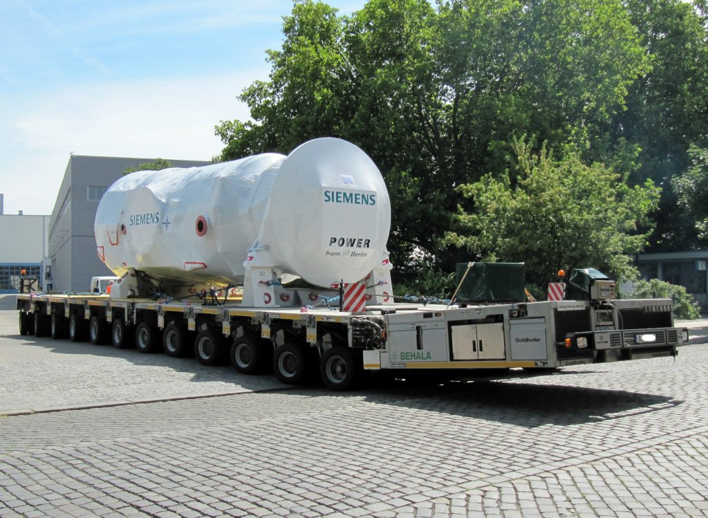 Goldhofer Modulfahrzeug der Behala verläßt am 19.07.2013 das Siemens-Werksgelände in Berlin-Moabit mit einer Gasturbine