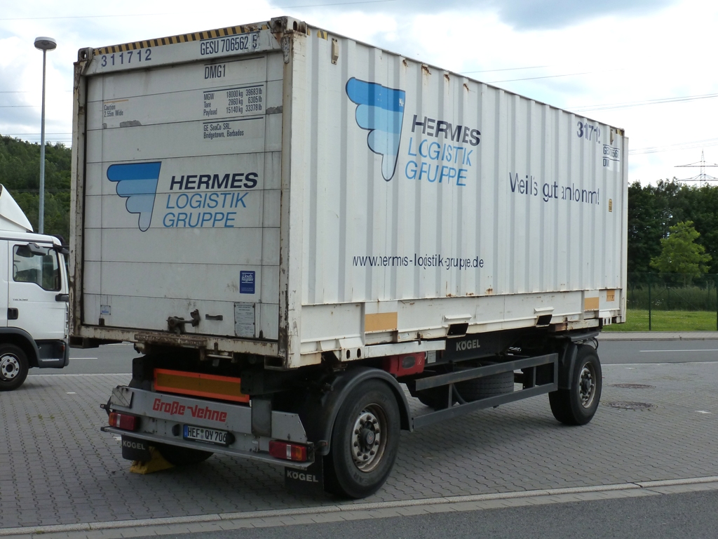 KÖGEL Anhänger mit HERMES LOGISTIK GRUPPE Wechselbrücke in Herten abgestellt am 10.06.2012 Heckansicht Wechselkoffer mit Rolltor