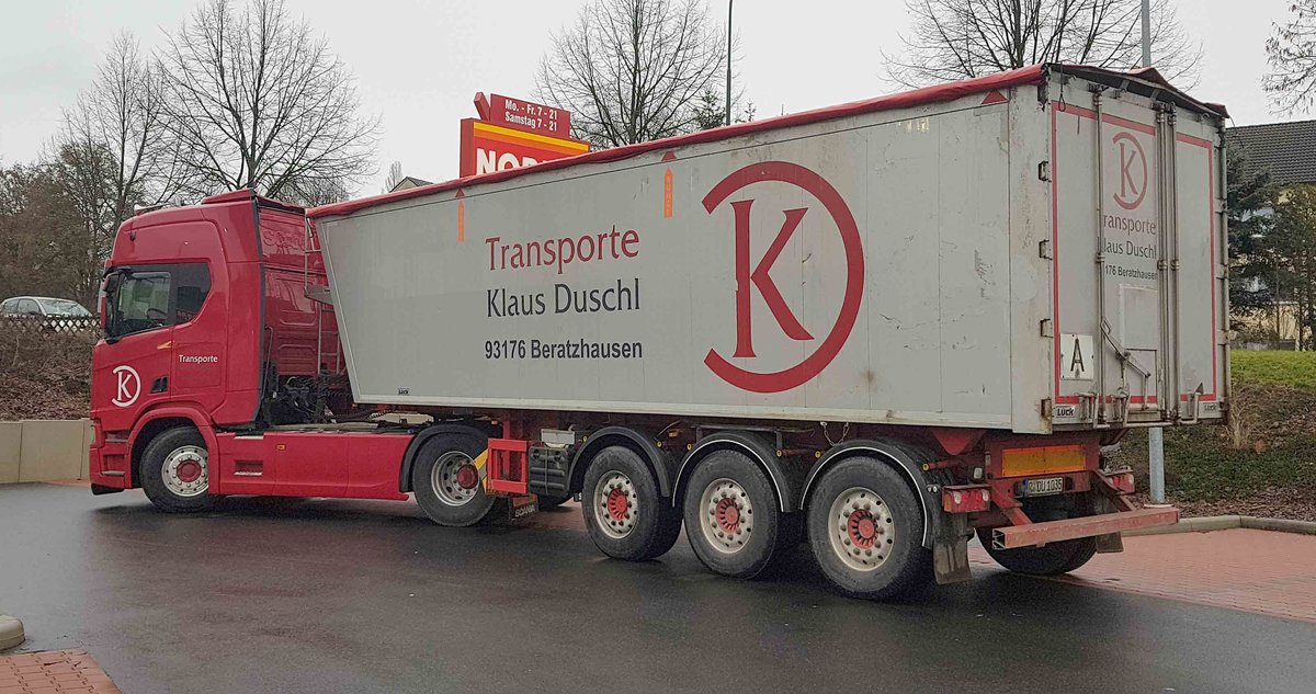 =Scania Sattelzug von Transporte DUSCHL steht im Februar 2021 in Fulda