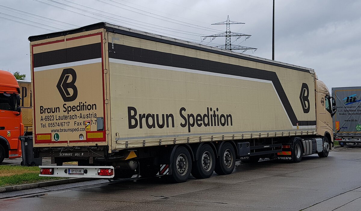=Volvo FH 460-Sattelzug der Spedition BRAUN steht im Mai 2021 auf einer Rastanlage an der A 5