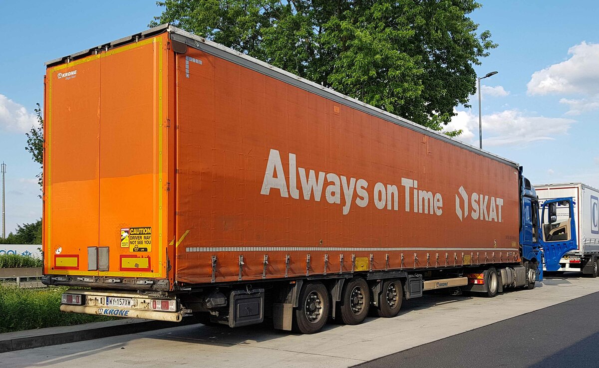 =Auflieger der Spedition SKAT, gesehen auf dem Rasthof Bruchsal im Juli 2021