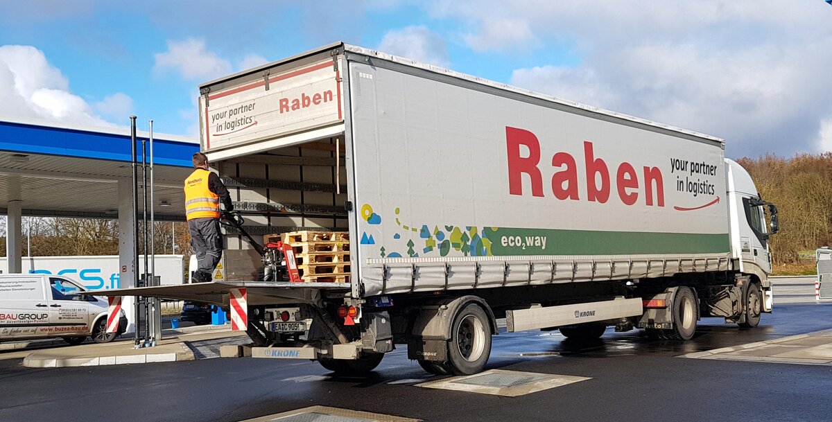 =Iveco Stralis 460 mit einem Sattelauflieger von RABEN steht zur Entladung in Fulda, 11-2021
