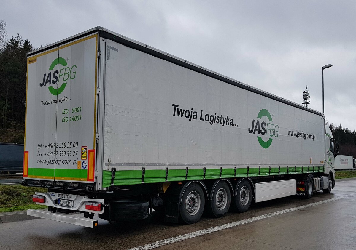 =Volvo-Sattelzug der Spedition JAS FBG aus Polen rastet im April 2023 an der A 7