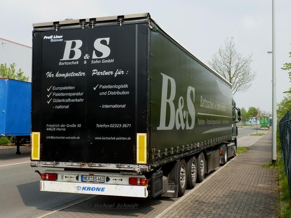 Heckansicht des silber schwarzen KRONE Sattelzuges B&S BARTOSCHEK & SOHN GmbH in HERNE 01,05,2012
