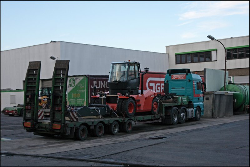 Beispiel was GRUBER transportiert: Ein Stapler? von Linde mit der Baureihenbezeichnung H120. Zugmaschine ist ein MAN TGX 26.480. (08.11.2008)