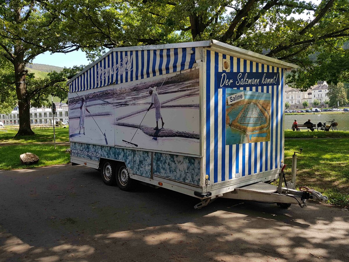 =Anhänger der Firma Salzimport SCHWEIZER, als Verkaufsstand, steht auf dem Weinfestgelände von Bernkastel-Kues, 08-2023