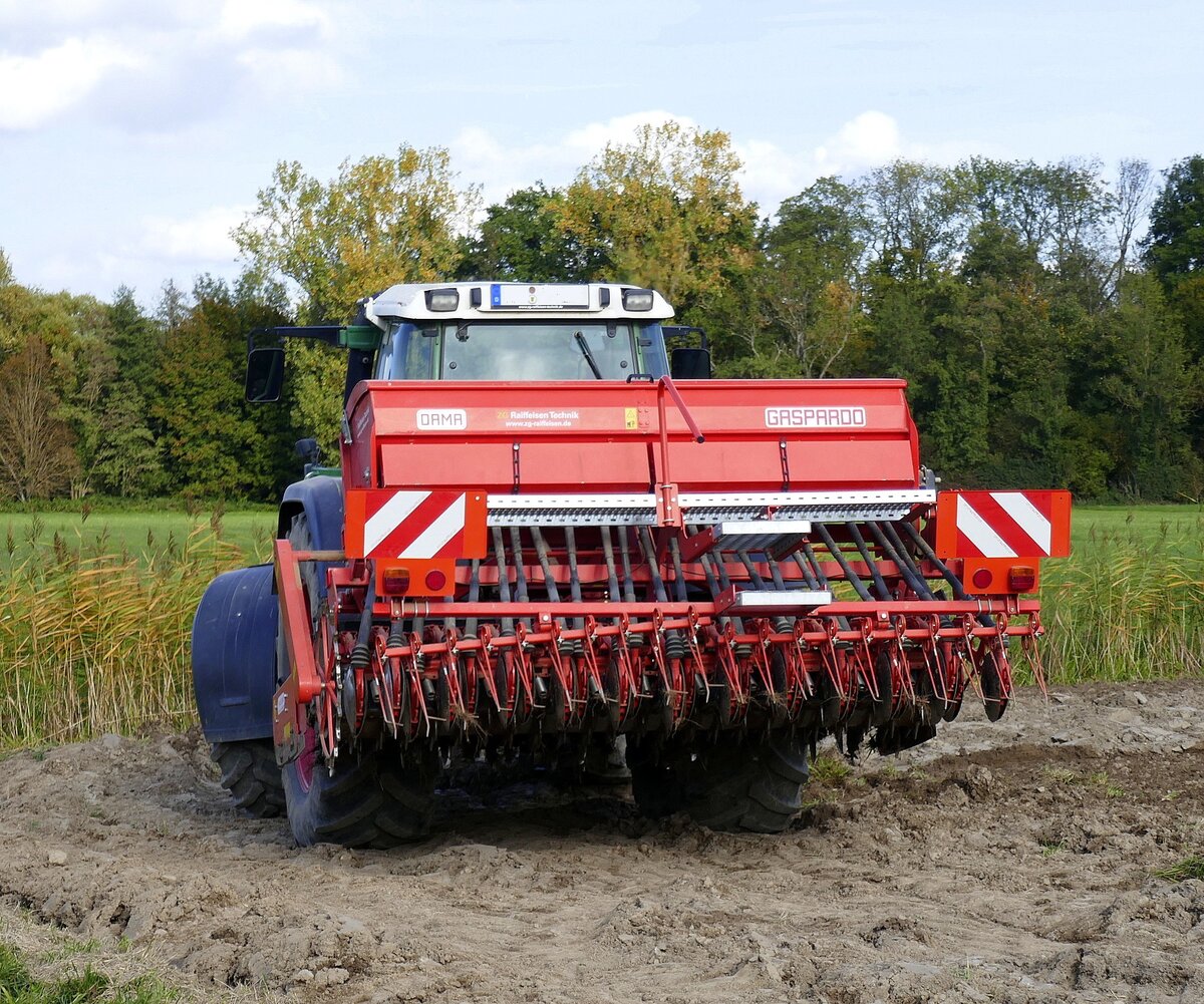 Drillmaschine der italienischen Firma Maschino Gaspardo, Heckansicht in Transportstellung, Okt.2022