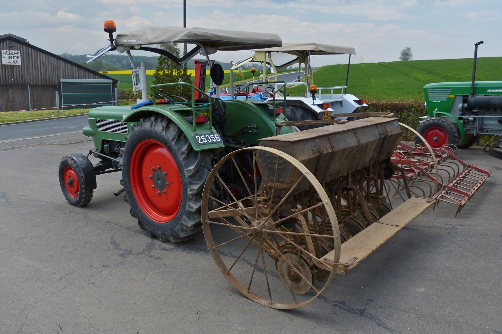 Sämaschine hängt am Fendt Farmer 2, aufgenommen beim „Baurefest in Brotebach“. 14.05.2023