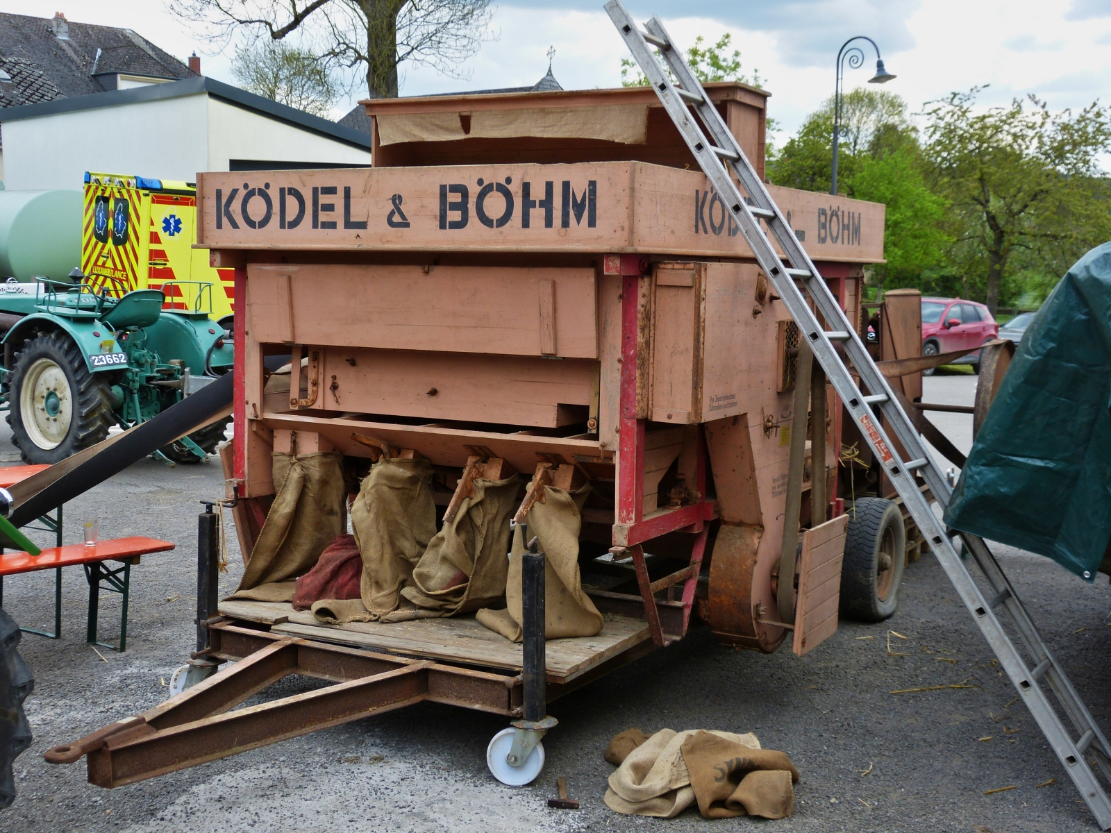 Steyr 80 steht vor dem Dreschkasten um diesen später bei der Vorführung über den Riemen Trieb in Bewegung zu setzen, gesehen beim „Baurefest in Brotebach“. 14.05.2023