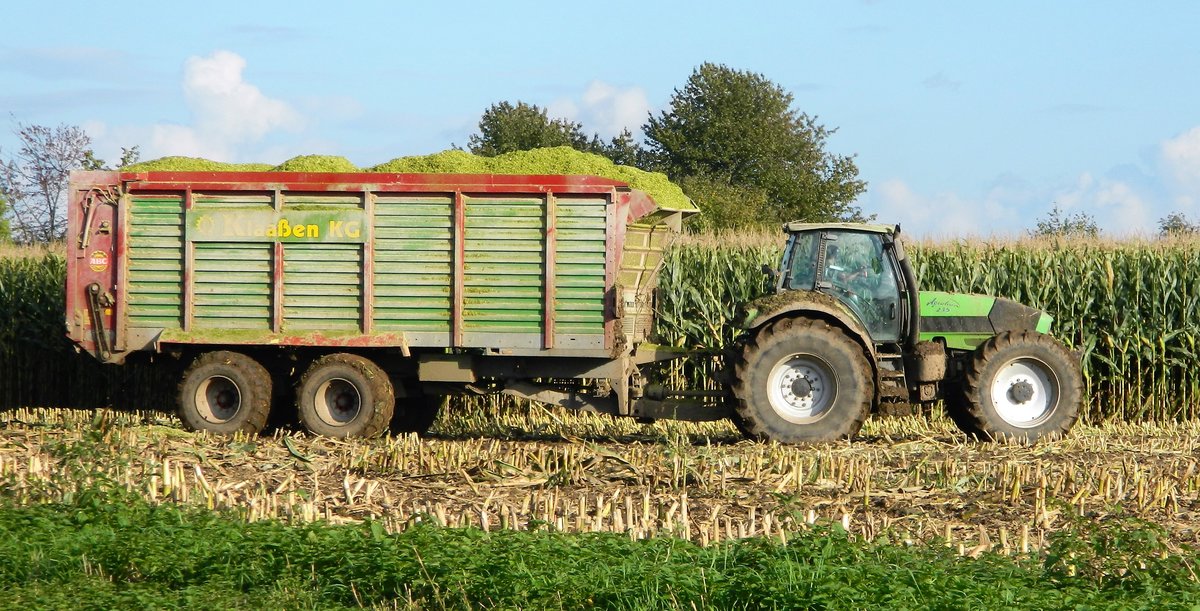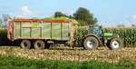 Der Deutz-Fahr Agrotron 235 mit einem Ladewagen bei der Bio-Mais-Ernte am 03.10.2017 im Raum Lützen (Lohnunternehmen Klaaßen KG).