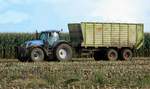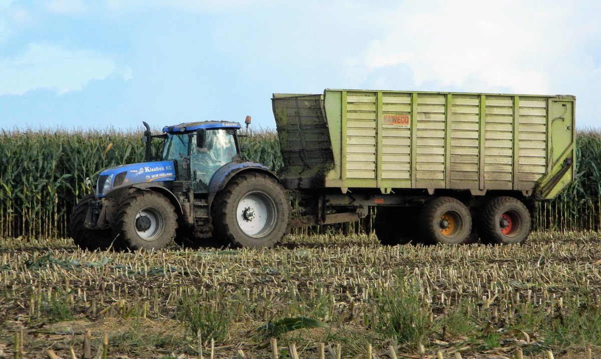 Der New Holland T7.270 mit einem Ladewagen bei der Bio-Mais-Ernte am 03.10.2017 im Raum Lützen (Lohnunternehmen Klaaßen KG).