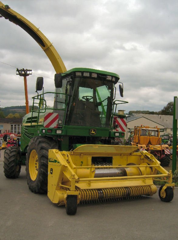 John Deere Häcksler mit Gras Pickup am Eingang zum Gelände des John Deere Händlers in Schellenberg.Auf dem Gelände fand das 6. Traktorentreffen statt.