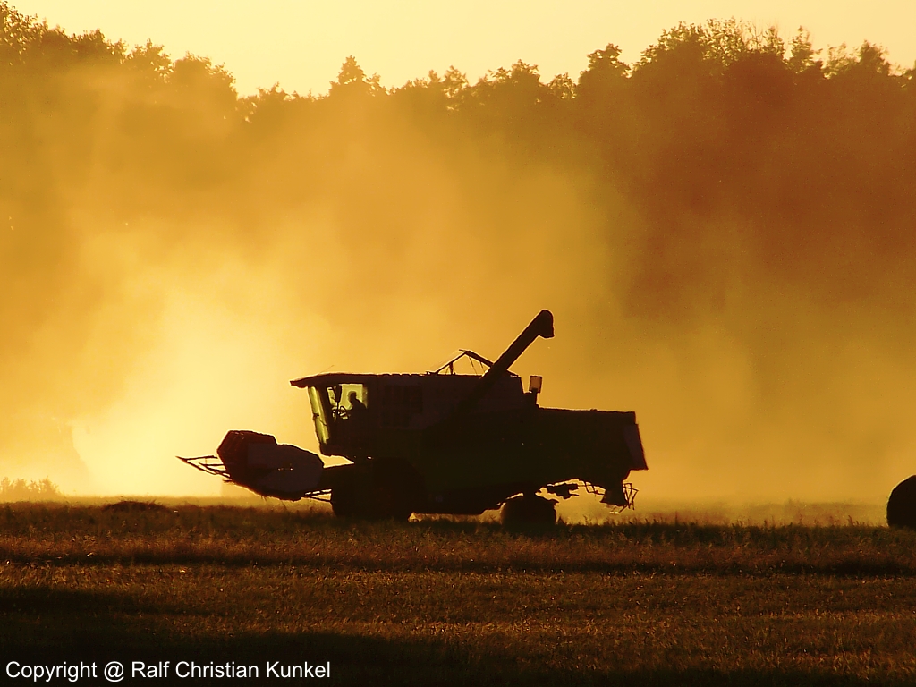 Claas Medion 310 Mähdrescher bei der Ernte in der Abenddämmerung - fotografiert am 20.08.2009 im Land Brandenburg - Copyright @ Ralf Christian Kunkel