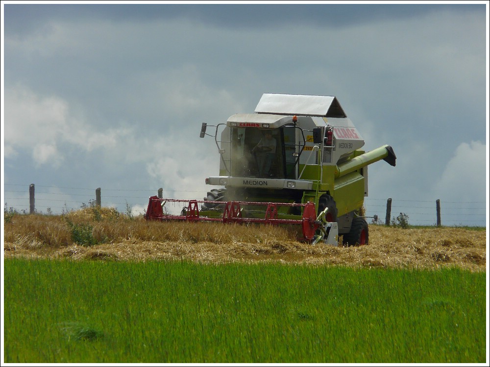 Zum Vergleich mit ID 40689, die moderne Getreideernte von heute, hier mit einem Claas Medion 310 Mähdrescher, gesehen am 02.08.2010 im Norden von Luxemburg.