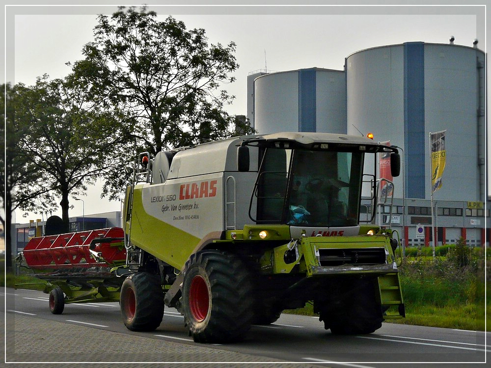 Claas Lexion 550 fährt am späten Nachmittag des 02.09.11 mit angehängtem Mähwerk zum nächsten Einsatz.