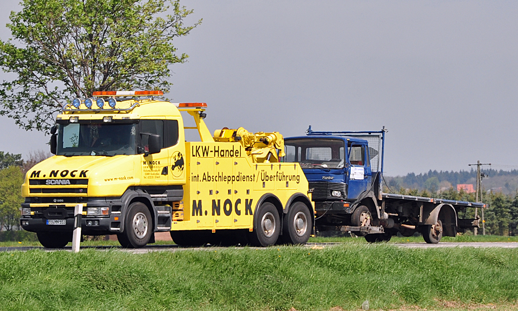 Scania 580 Abschlepp-/Bergefahrzeug "M. Nock" mit defektem LKW am Haken bei Heimerzheim 22.04.2010