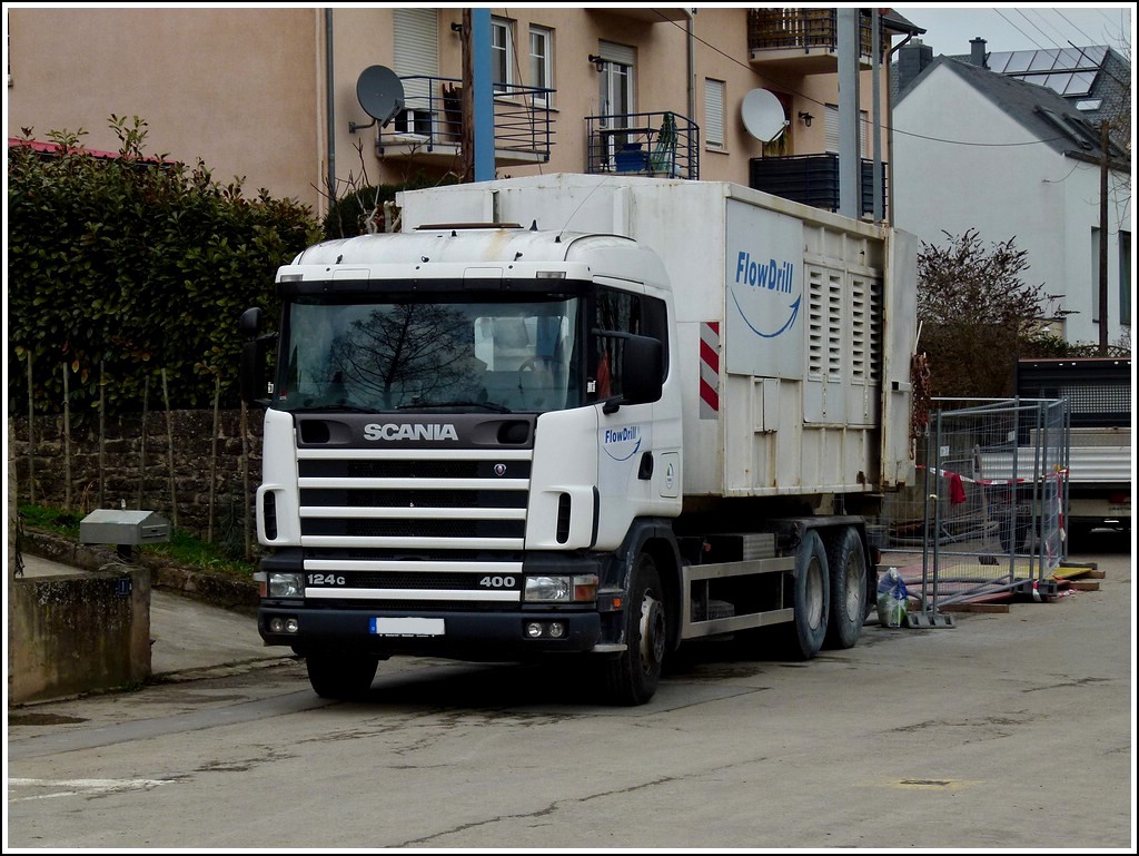 Bei einer Strassenbaustelle ist mir dieser Scania 124 C it eine Spezialcontainer aufgefallen. 19.03.2012