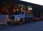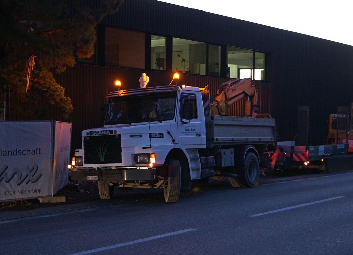 SCANIA: SCANIA 113H-Kipper in der Abenddämmerung bei Niederbipp am 22. Dezember 2014.