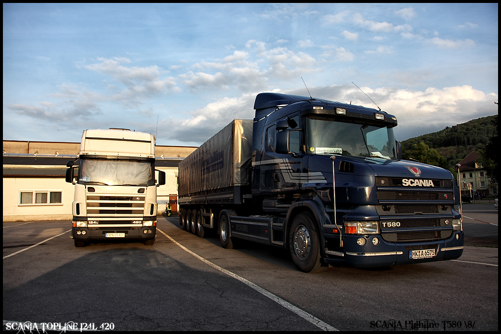 SCANIA TOPLINE 124L 420 aus Polen und ein SCANIA Highline T580 in Plettenberg. (14.06.2010)