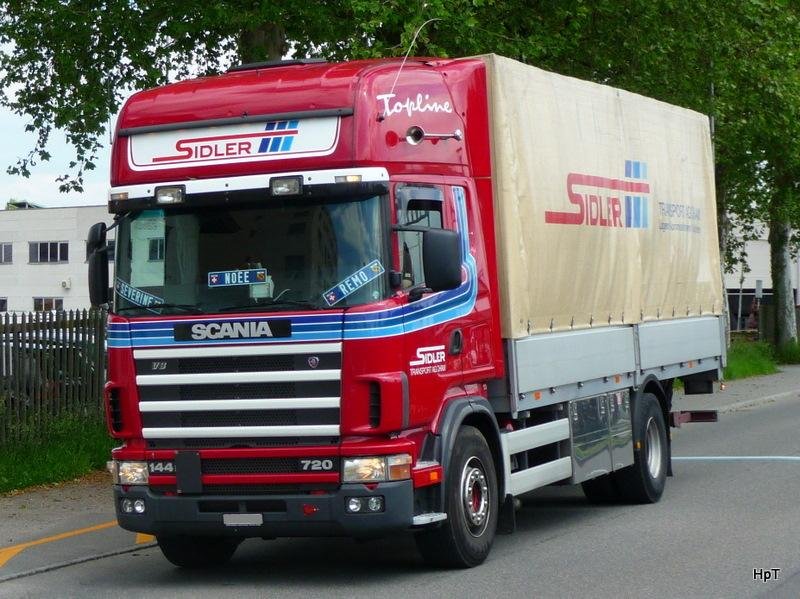 Scania 144 mit Pritschenaufbau unterwegs in der Stadt Sursee am 04.06.2010
