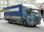 Scania P 340 mit Pritschenaufbau unterwegs in der Stadt Solothurn am 19.04.2023