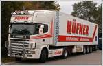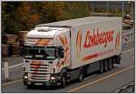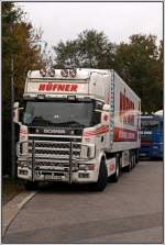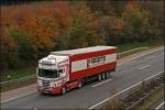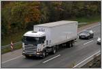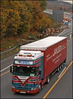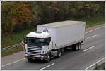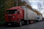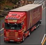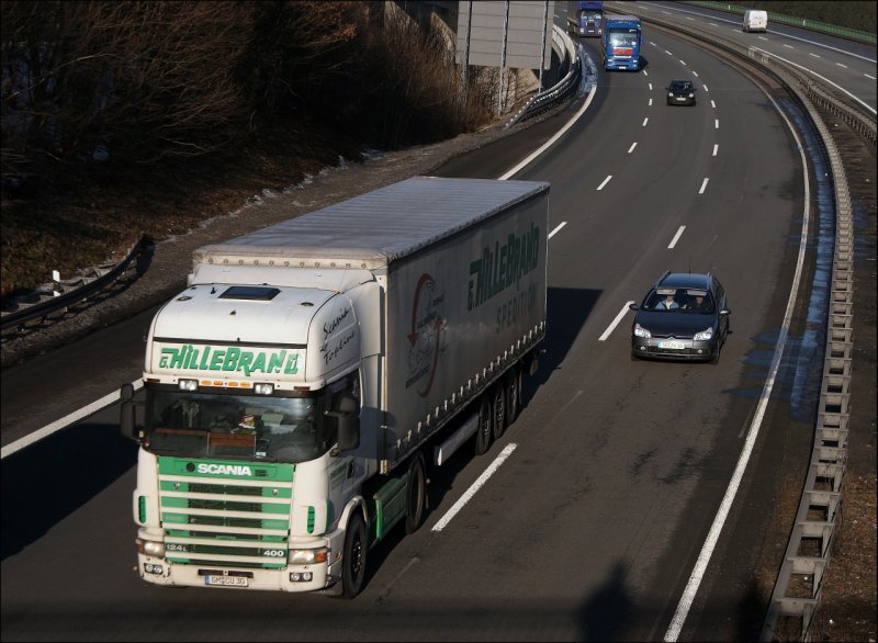 Scania Topline 124L 400PS von Hillebrand ist auf dem Heimweg nach Bergneustadt/Drolshagen. So wie es aussieht hat sich das Unternehmen auf den Verkehr nach Russland spezialisiert. (15.01.2009)