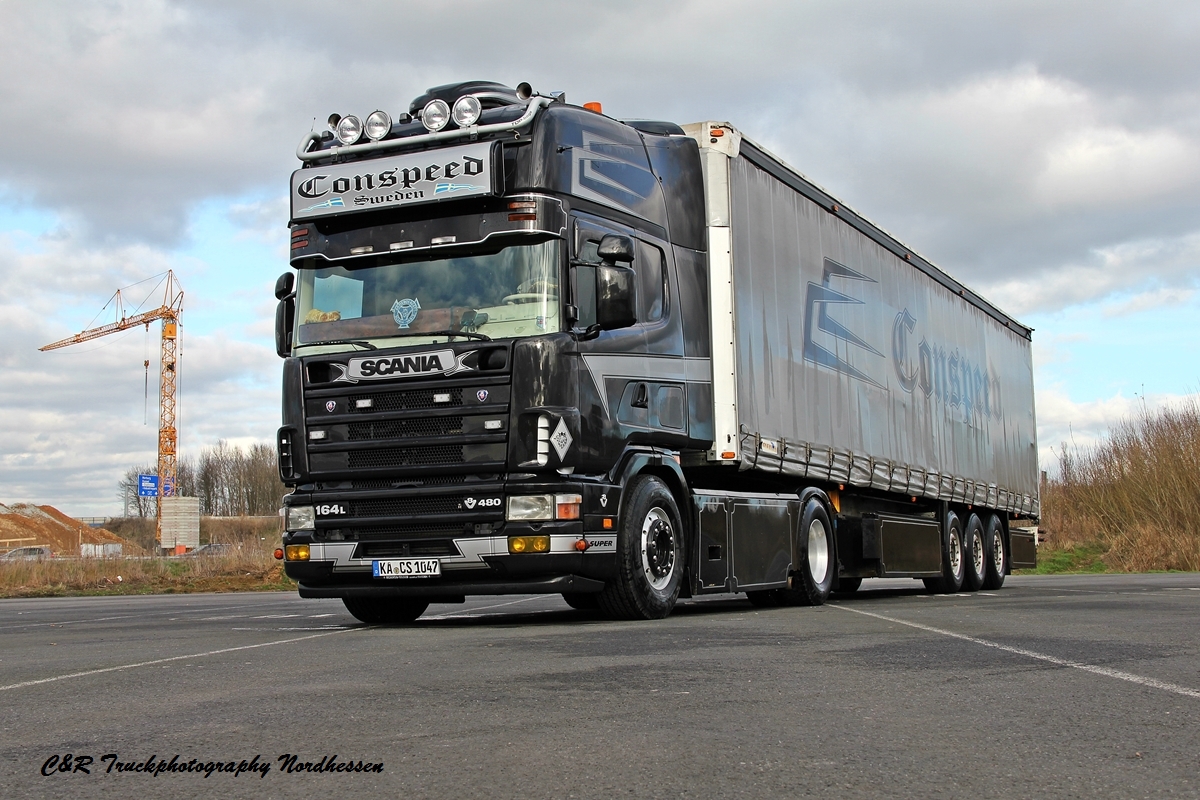 Scania 164L 480 V8 Topline von Conspeed mit Planenauflieger. Kassel 14.02.2014