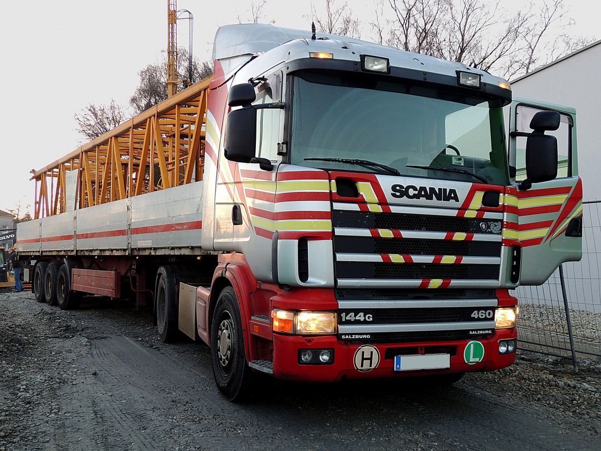 SCANIA 144G 460, hat Kranbauteile geladen; 140301