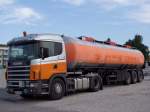 Scania 124 L 420 mit Eutertankauflieger , fotografiert am 18.09.2013.