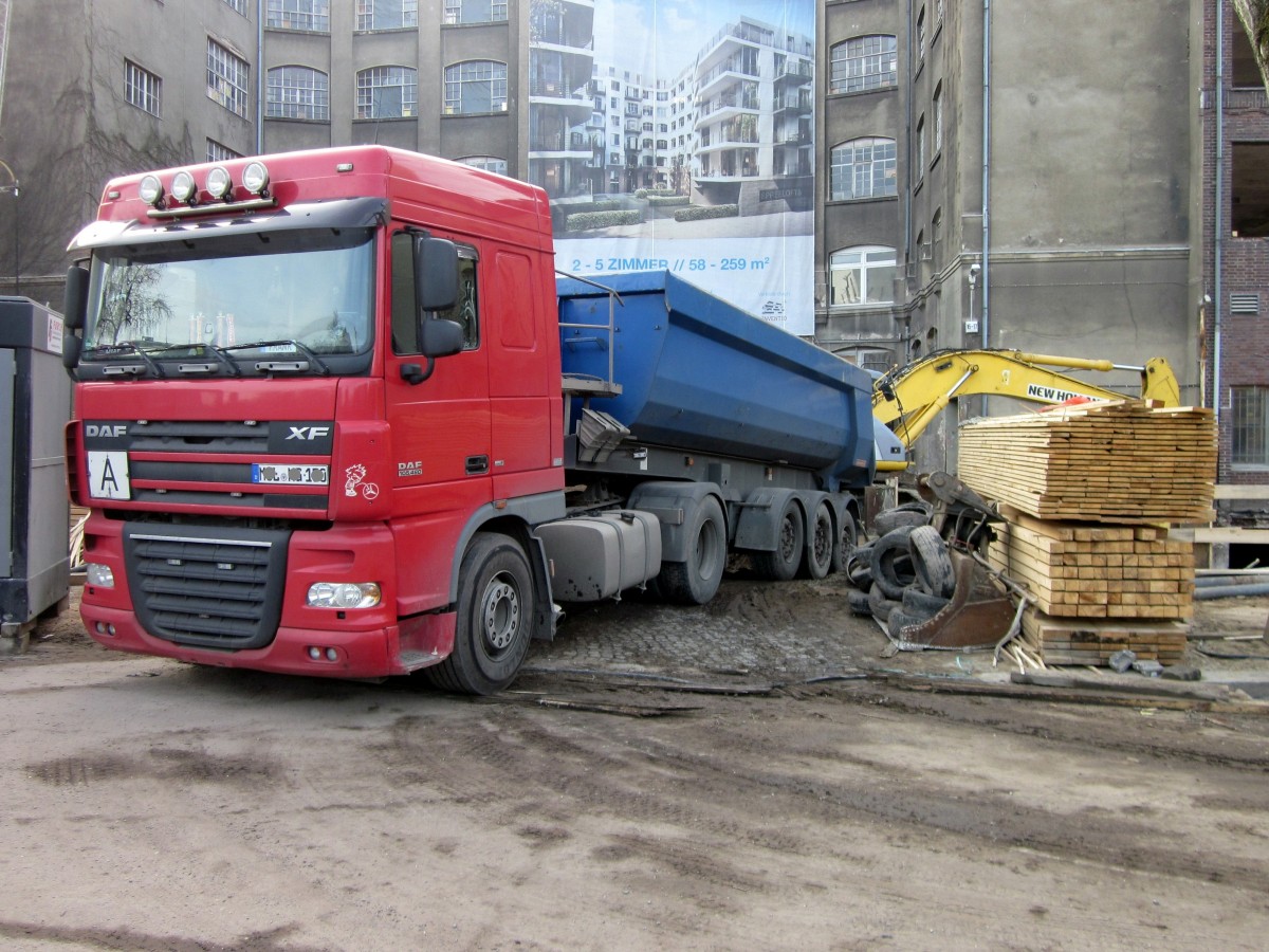 DAF XF 105.460 Kippsattelzug wartet im Februar 2014 auf einer Baustelle in Bln.-Charlottenburg auf seine Beladung
