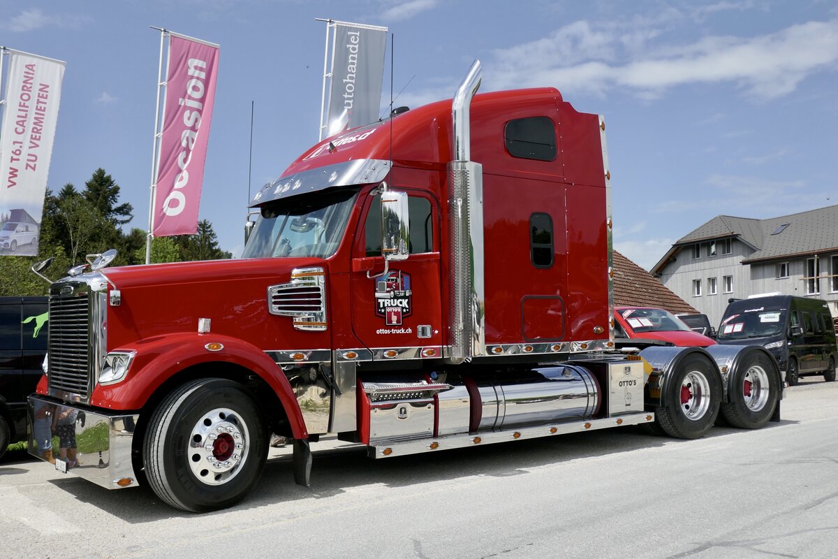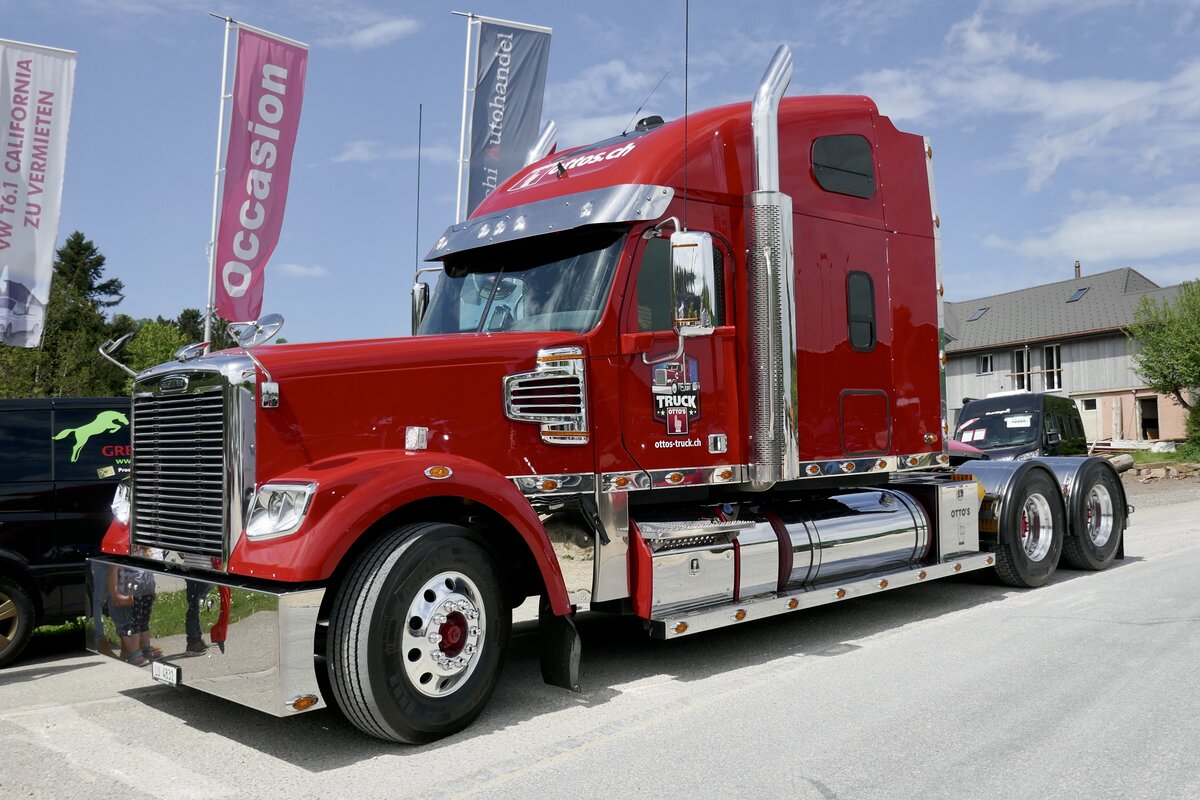 Eine Frightliner Zugmaschine von Otto's die am 29.6.24 beim Trucker Festival Interlaken steht.