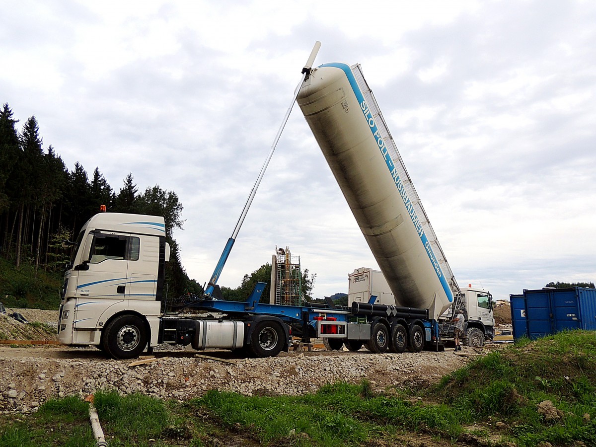 MAN-Silofahrzeug drückt per Pneumatik Zementhaltiges Schüttgut in den bereitgestellten Streuwagen; beste Grüsse an den freundlichen Fahrer; 1408225