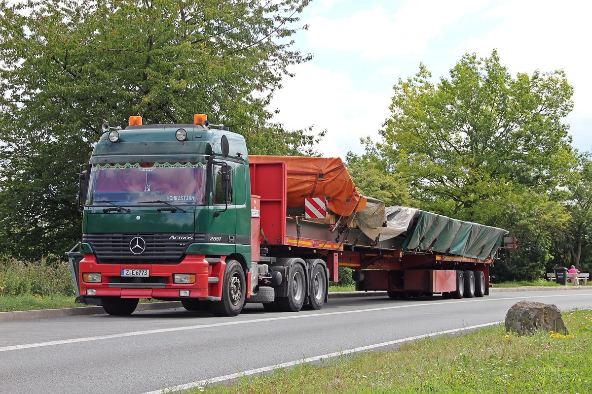 Mercedes Benz Actros Mp1 2657 V8 6x4 mit Ausziehbaren Langmaterialauflieger auf einem Parkplatz zwischen Breuna und Warburg A44. 08.08.2012