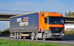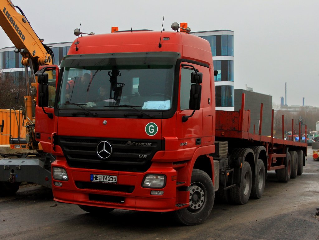 Noch schnell den Beifahrer anschnallen und schon geht es los. Actros V8 2658 mit 3achser Pritschenauflieger nach dem Abladen auf einer Baustelle in Aachen. (24.02.2012)