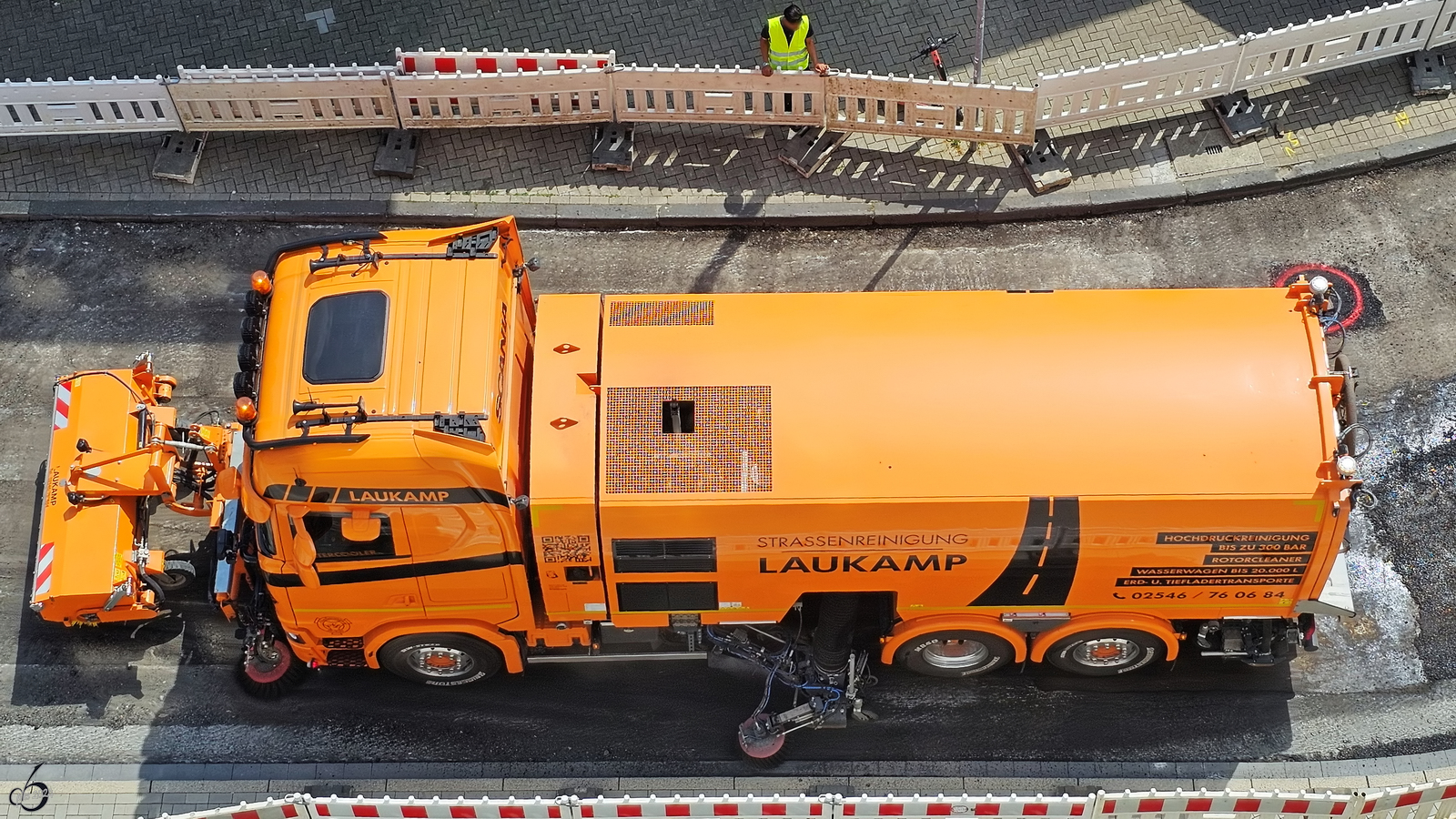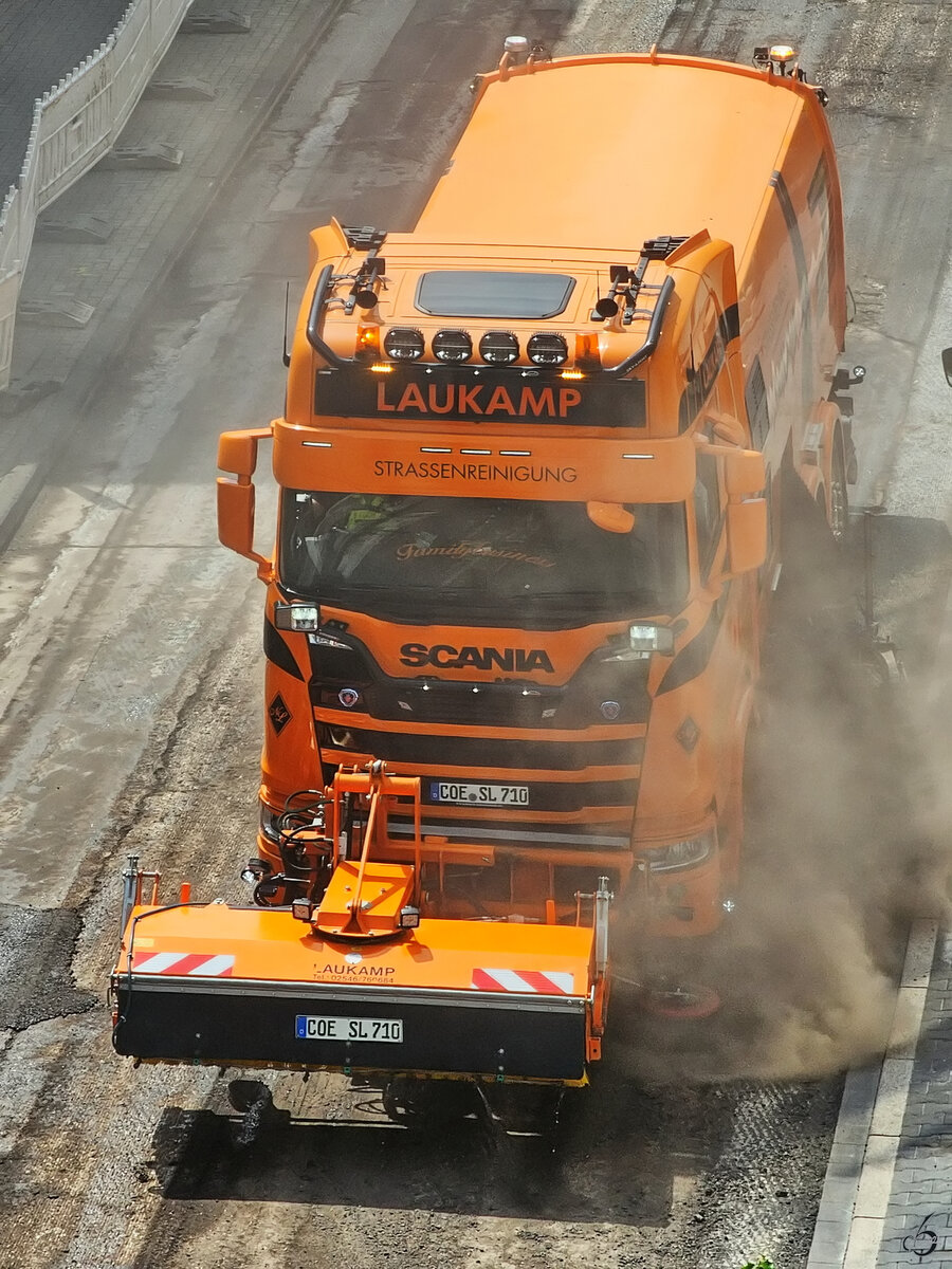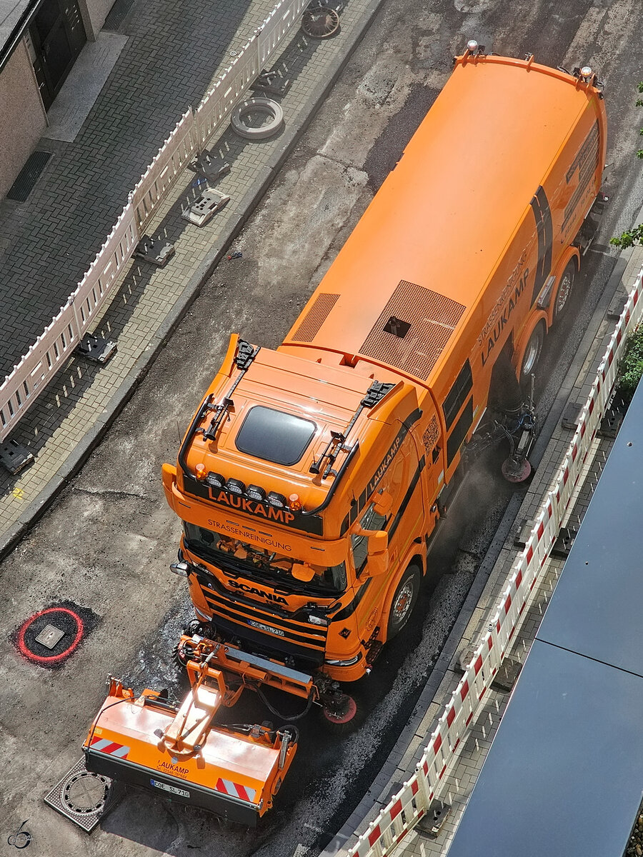 Diese Scania Fahrbahnkehrmaschine war Mitte Juli 2024 in der Innenstadt von Bochum im Einsatz.
