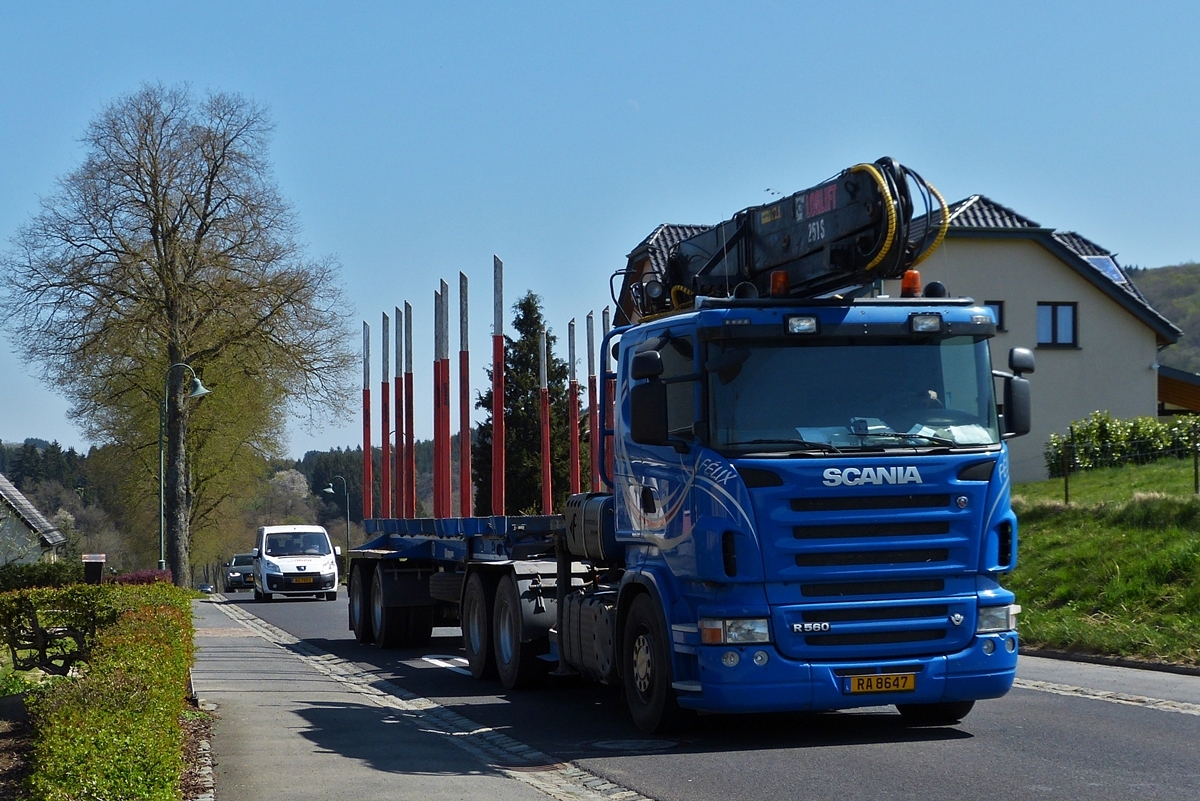 . Scania R 560 Holztransporter auf dem Weg zur nächsten Beladestelle. 24.04.2015