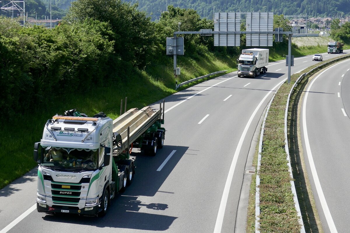 Scania Holztransporter und weitere LKW von Martin Schaller die am 28.6.24 auf dem Weg zum Trucker Festival auf der A8 in Matten b. Interlaken unterwegs sind.