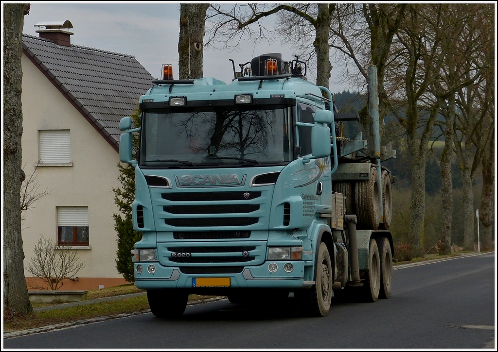 Scania R 620 mit Aufbau für Langholtransport hat die Hinterachse Huckepack auf dem Weg zur nächsten Ladestelle. 08.03.2013