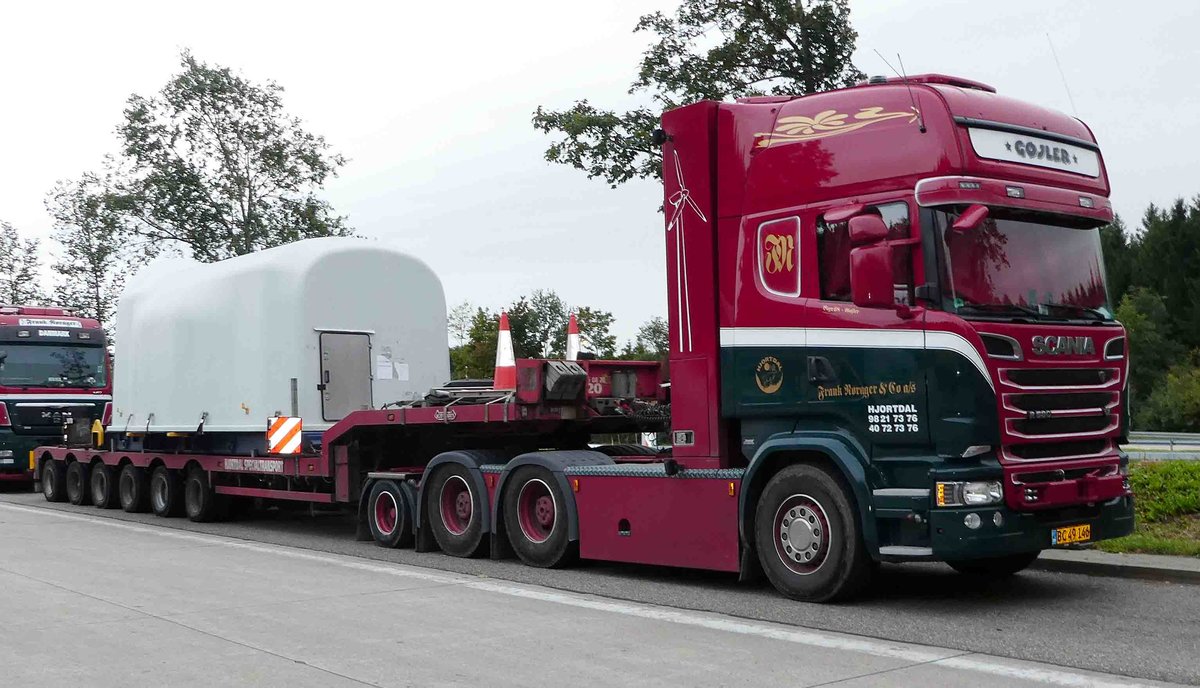 =Scania der Spedition "Frank Norager" aus Dänemark, beladen mit einem Teil einer Windenergieanlage von Vestas, steht auf einer Rastanlage an der A7, 09-2017
