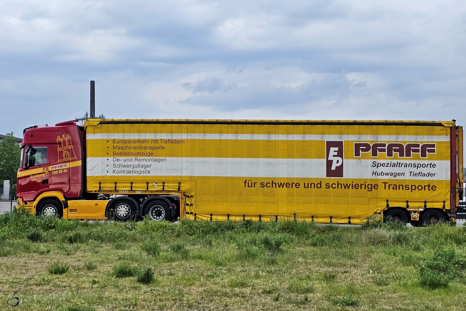 Dieser Scania-Schwerlasttransporter pausierte Anfang Mai 2024 in einem Hattinger Industriegebiet.