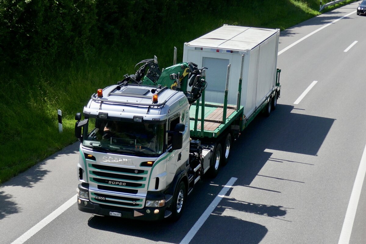 Scania mit Tieflader von Martin Schaller der am 28.6.24 unterwegs zum Trucker Festival ist auf der A8 in Matten b. Interlaken.