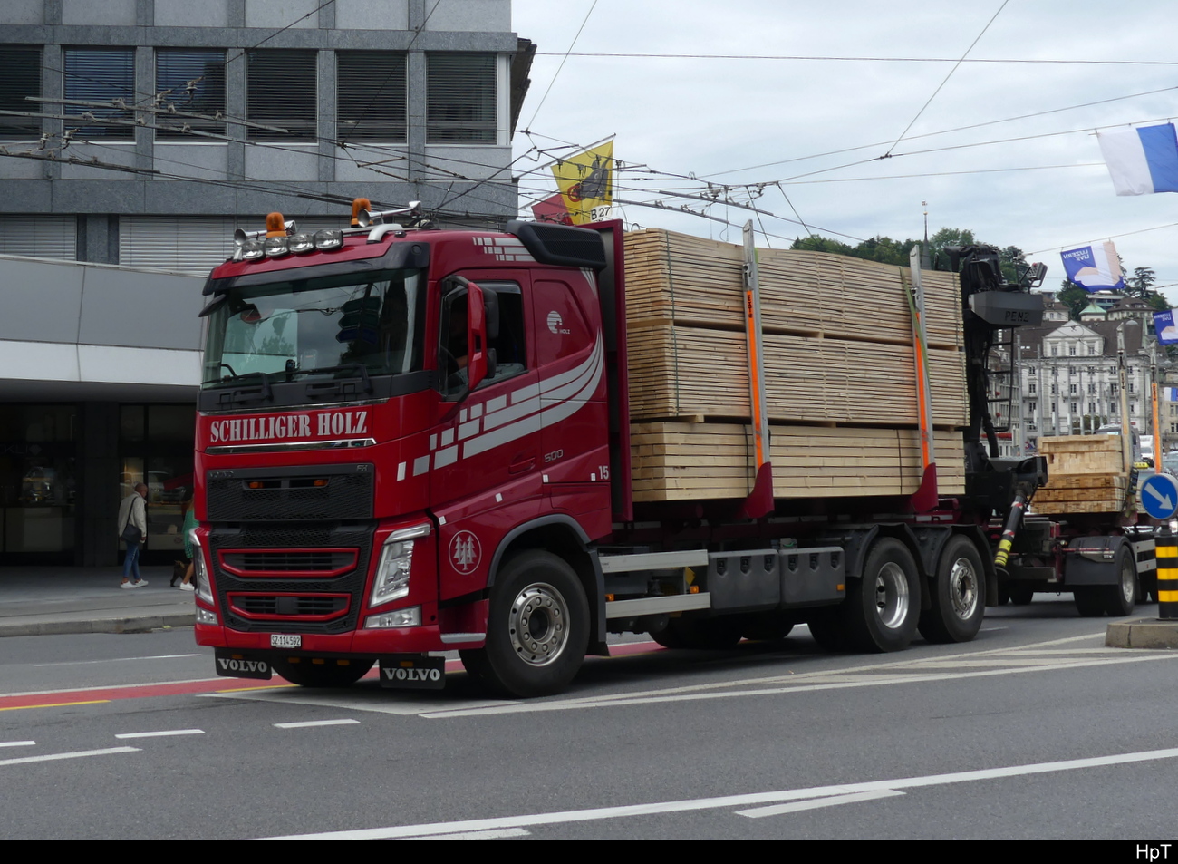 Volvo Holztransporter unterwegs in der Stadt Luzern am 27.07.2023