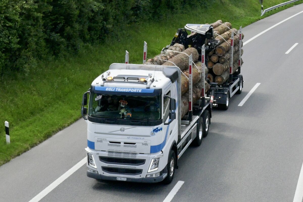 Ein Volvo FH Holztransporter von Küschä Holztrans AG der am 28.6.24 zum Trucker Festival fährt in Bönigen.