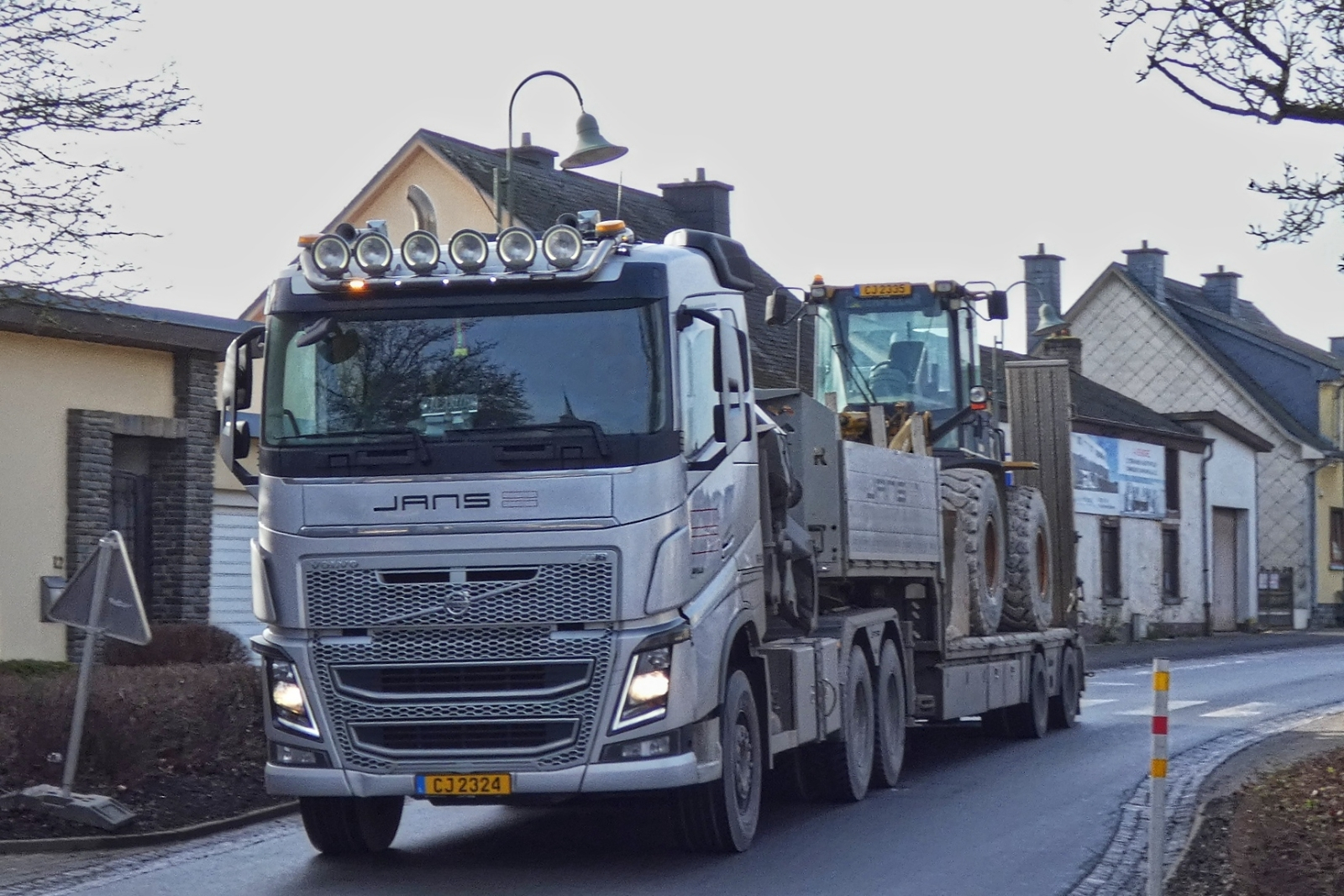 Volvo FH, Schwerlastsattelzug, beladen mit einem Volvo Raupenbagger, macht sich auf den Heimweg. 11.2025
