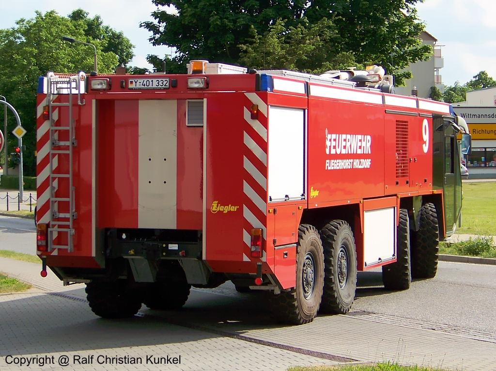 Schweres Feuerlöschkraftfahrzeug FlKfz (12.500) Ziegler Z8 (ALPAS-Kofferaufbau) der Fliegerhorstfeuerwehr Holzdorf (Bundeswehr) - Fahrgestell MAN SX 36.1000 VFAEG 8x8 - techn. Daten MAN-V12 mit 1000 PS, Vmax. 138 km/h, Renk 5-Gang-Automatikgetriebe mit Retarder, perm. Allradantrieb, zul. Gesamtgewicht 39.500 kg, L x B x H: 12.000 x 3.500 x 3.700 mm - mitgeführte Löschmittel: 12.500 l Wasser, 1.250 l Schaummittel - Löschtechnik: Pumpe Ziegler FP 80/10-1A, Pumpenmotor 6-Zylinder-Diesel mit 338 kW / 460 PS, Pumpenleistung 8000 l/min bei 10 bar sowie 10.000 l/min bei 8 bar - fotografiert am 14.06.2010 im Land Brandenburg - Copyright @ Ralf Christian Kunkel